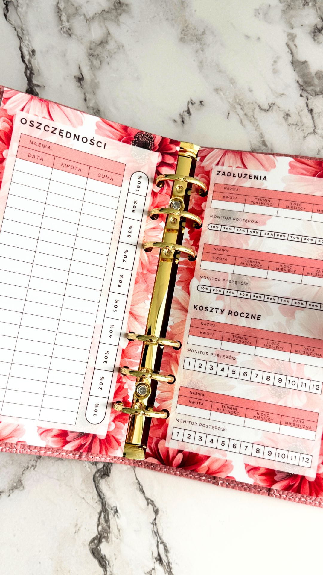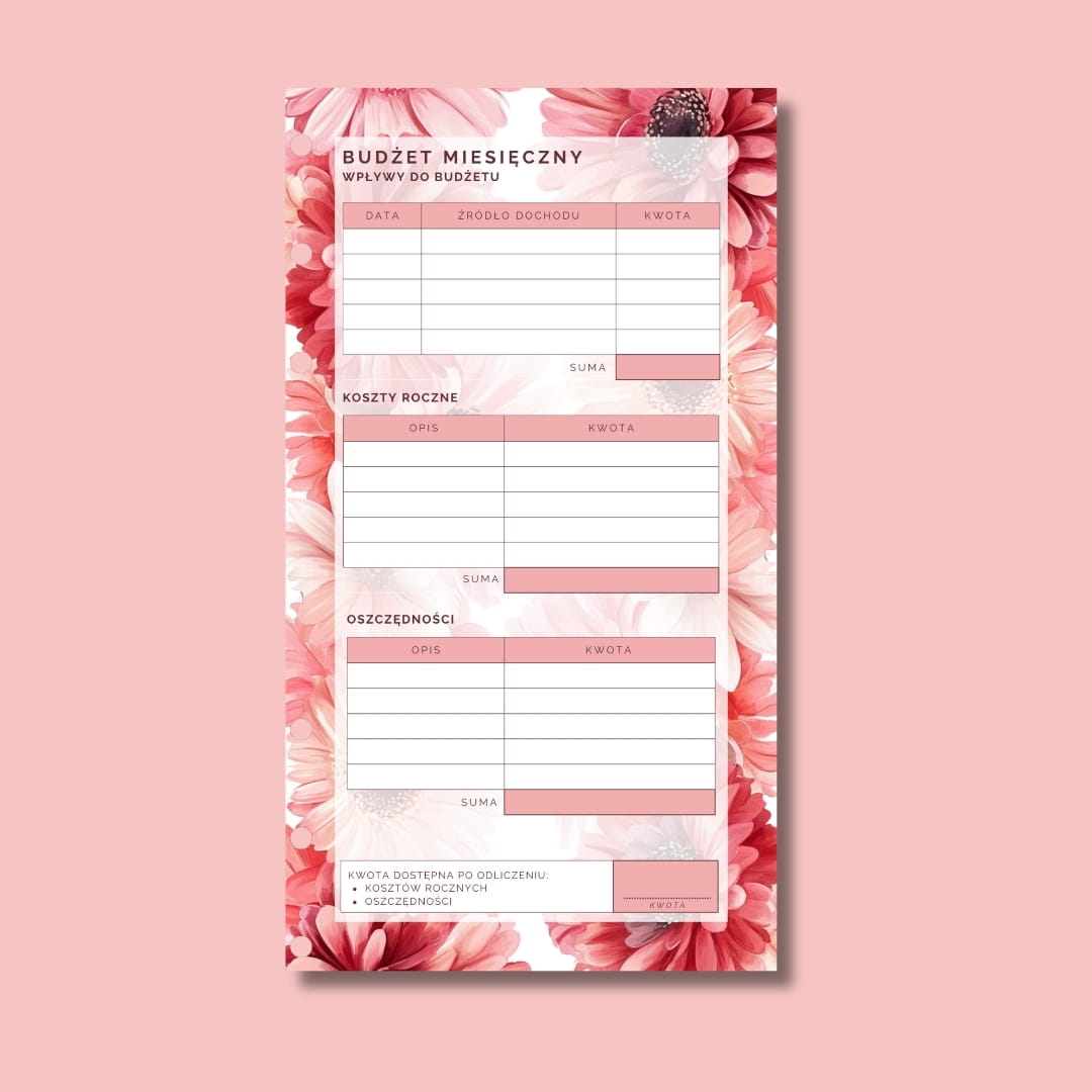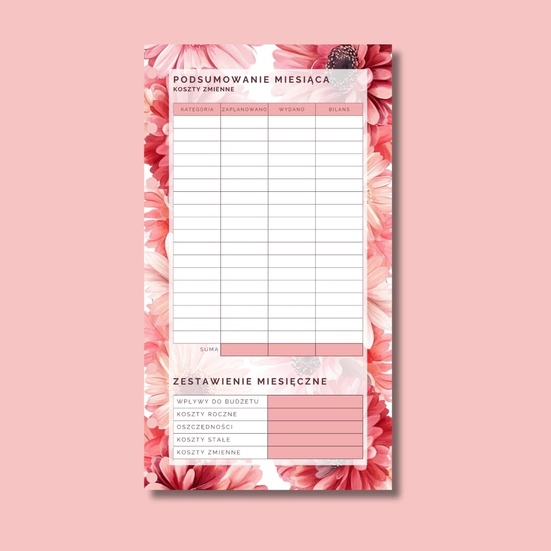 Dobrze sprawdzi się w segregatorze A6 jako szybki podgląd najważniejszych wydatków i planów.